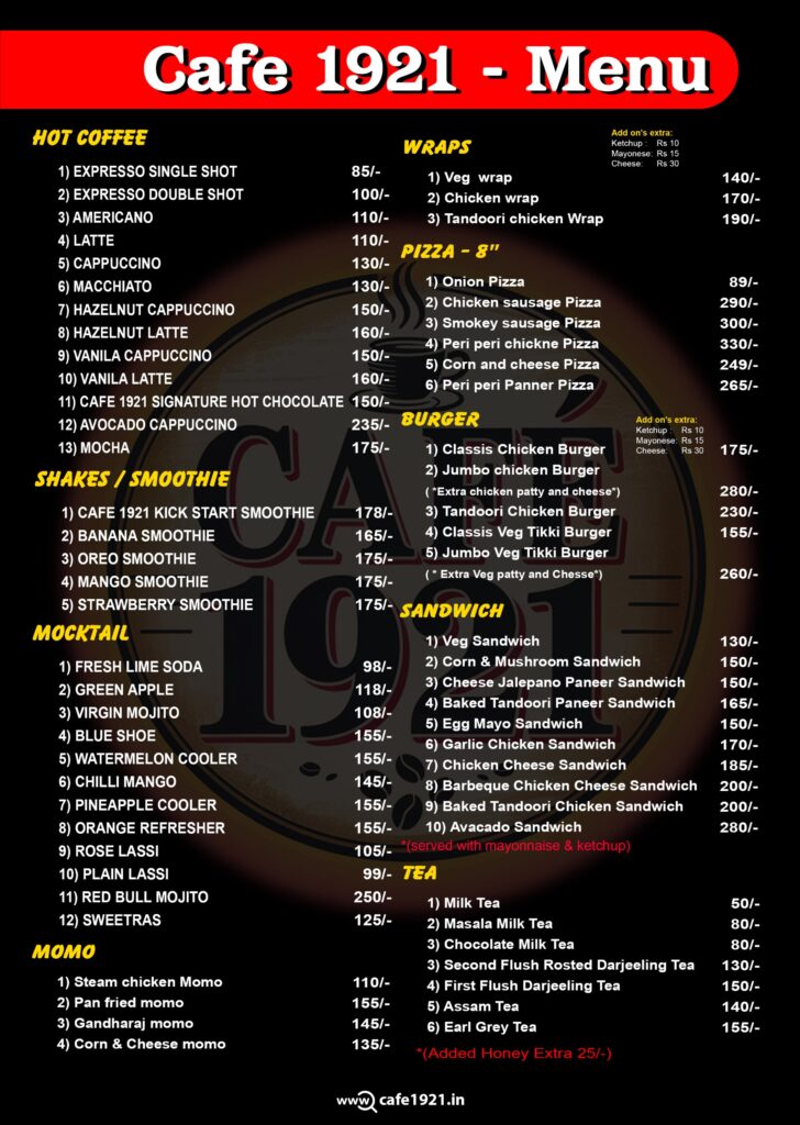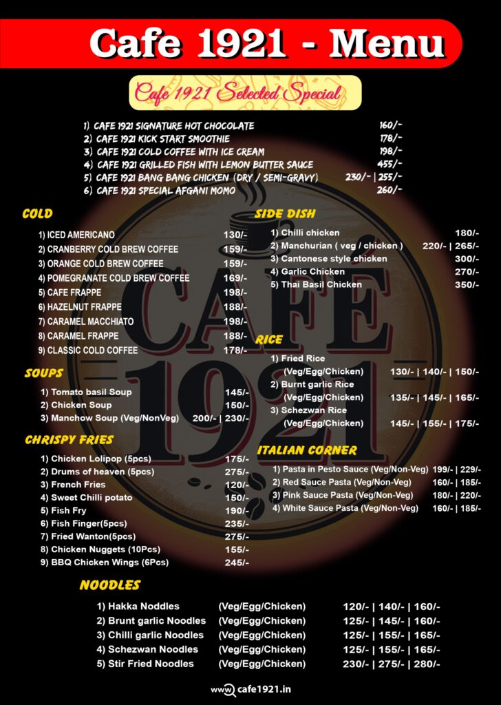 At Café 1921, we blend the aroma of freshly brewed coffee with the irresistible flavors of handcrafted pizzas, cheesy wraps, delicious burgers, Chinese platters, and refreshing beverages. Whether you’re here for a lazy brunch, a quick coffee break, or a fun evening hangout, Café 1921 has something to please every taste bud.